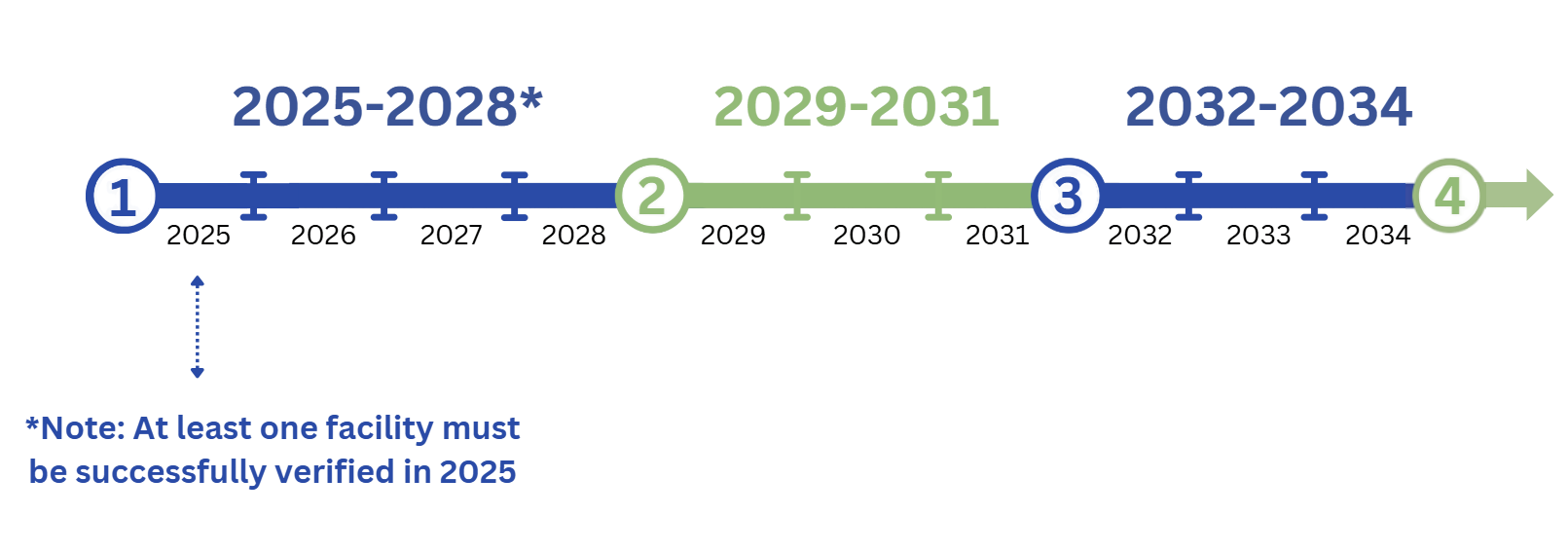 OCS Logistics Verification is administered in verification cycles. The first verification cycle began in January 2025 and will terminate in December 2028 to align with the OCS Blue Verification Cycle. Each OCS Logistics member must verify at least one facility during the 2025 calendar year.